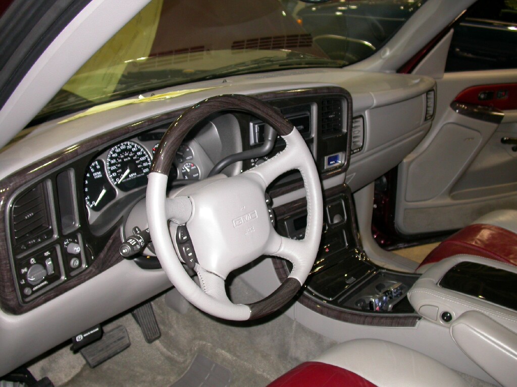 This is Disturbing the Peace Customs' burgundy GMC Denali demo truck. A Pioneer in-dash a/v monitor sends signal to four U.S.Amps USA-400 amplifiers, which send high-level signal to four TREO Engineering CSX15 subwoofers in a painted fiberglass enclosure.